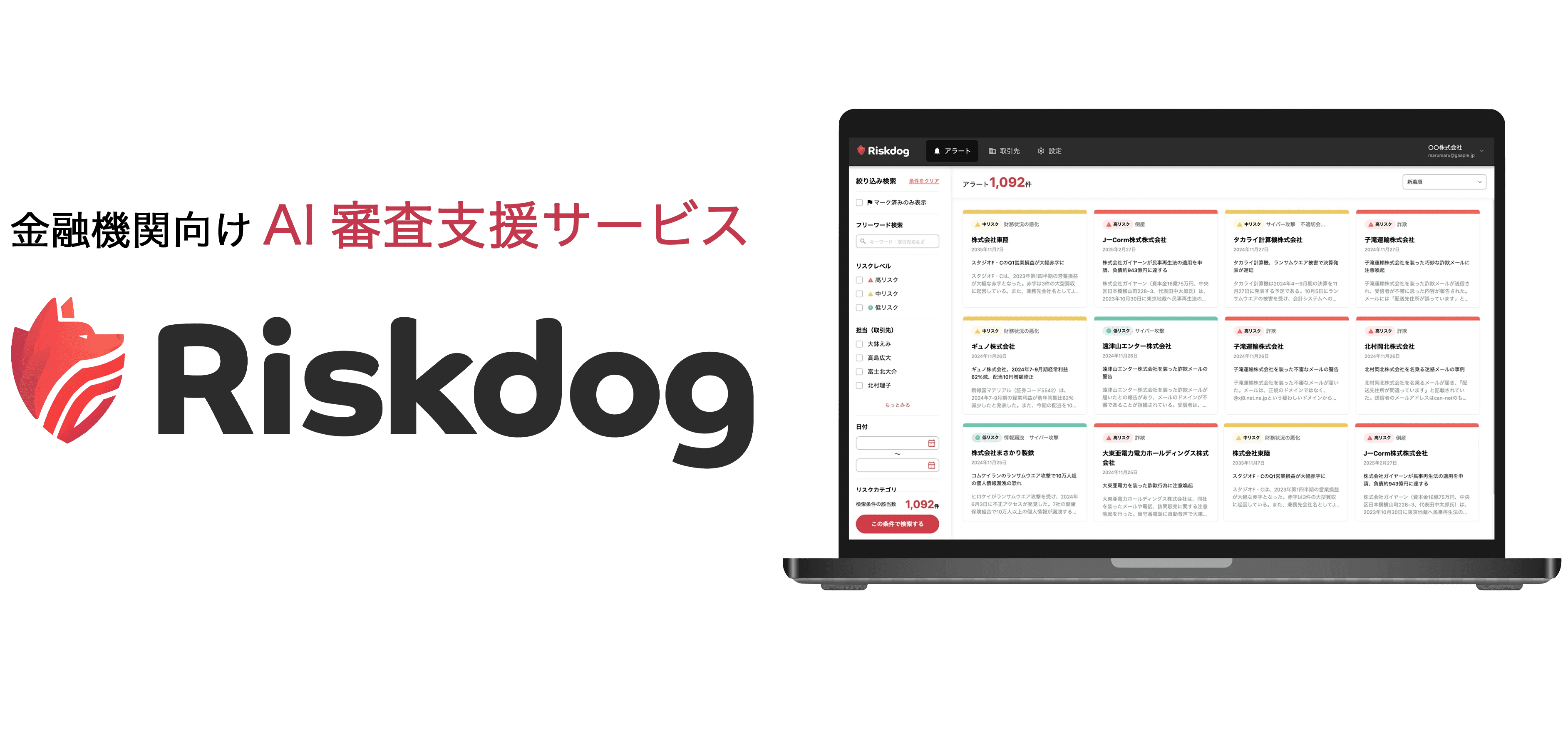 Riskdogは、AI技術で取引先リスク管理を効率化する審査支援サービスです。膨大な情報を解析し、倒産リスクや契約不履行など、ビジネスリスクを迅速かつ正確に評価。審査業務の生産性向上と安全な取引を支援します。