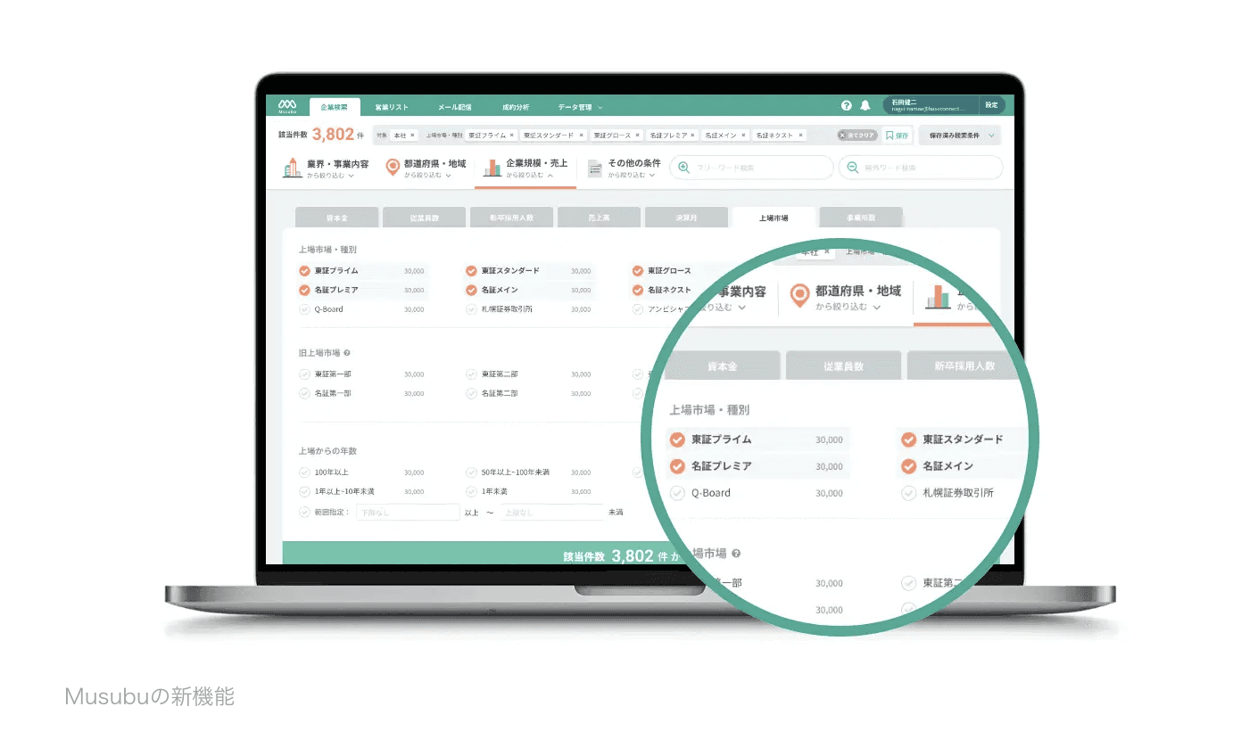 企業情報DB「Musubu」が東証市場再編後のデータを追加。企業データの検索軸が充実し、より精度の高いターゲティングリスト作成が可能になりました