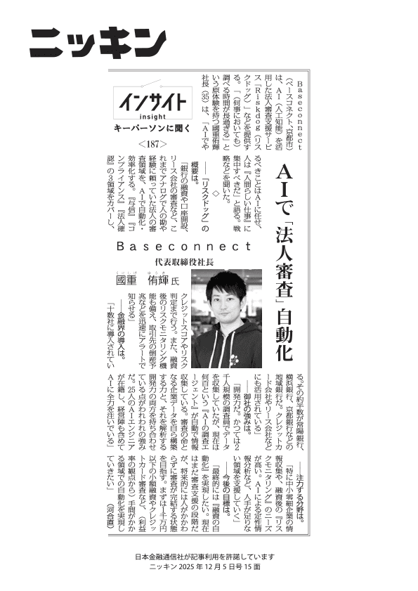 「ニッキン」(2025年12月5日号)の企画『インサイト:キーパーソンに聞く』 にて、代表・國重のインタビュー記事を掲載いただきました。